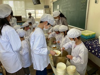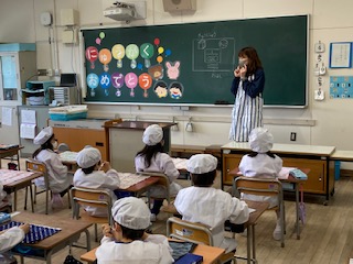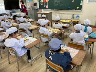 給食が始まりました。1年生にとって、小学校での初めての給食です。食器、おかず、牛乳の置く場所を担任の先生から教えてもらいました。6年生が給食の運搬や配膳を手伝ってくれました。早く用意ができ、しっかりと食べることができました。