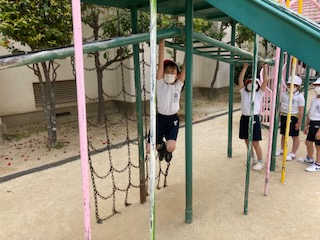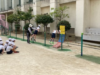 2年生が体育で、鉄棒や雲梯などを使って学習をしました。雲梯では最後までぶらさがって行くことができた児童もいました。
