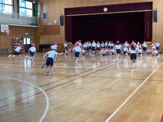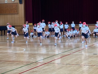 5年生が体育「体つくり運動」をしました。学年体育として、講堂で体の動きを高める運動をしました。体力テストをめざして、がんばっています。