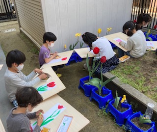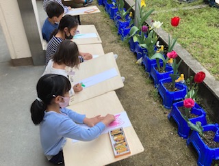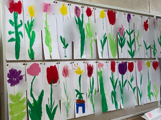 2年生が、1年生の時に育てたチューリップを描きました。大きく育ったチューリップを見て、喜んで楽しく描いていました。