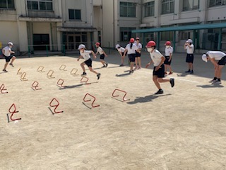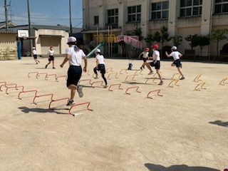 6年生が体育で、ミニハードルを使って色々なリズムで楽しく走ることで、運動感覚を養うことをねらいとして行いました。
