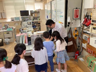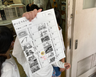 1年生が学校探検をしました。2年生が案内をしながら、一緒に校内を探検しました。探検カードにシールやスタンプを押してもらいました。2年生が上手に案内しました。