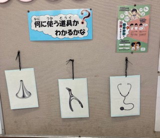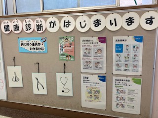 保健室前の掲示板には、健康診断の説明が掲示されています。内科検診、耳鼻咽喉科検診、運動器検診、尿検査など、子どもたちが受ける検診をわかりやすく説明してあります。緊急事態宣言が延長となっても、健康診断は予定通り実施します。