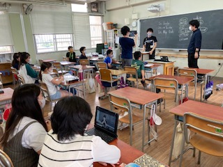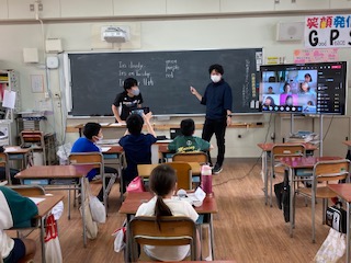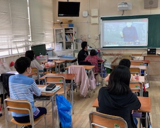 6年生が英語のオンライン授業をしました。預りの児童は、別教室でオンライン授業の様子を見て、学習しました。