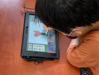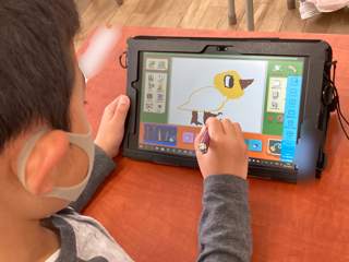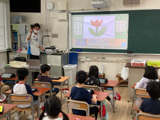 1年生がタブレット端末をはじめて使いました。タブレット端末の立ち上げ方を学び、その後はお絵かきをしました。とても興味があり、楽しくタブレット端末を操作していました。覚えも早いです。