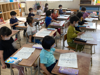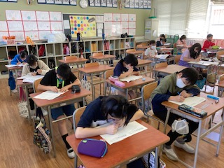 本日の預かり児童は235人です。全校児童の約52%です。どの学年も学習プリントなどに取り組んでいます。プリント学習に取り組むことで、理解度の定着を図りたいと思います。