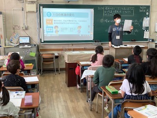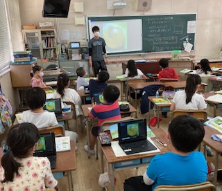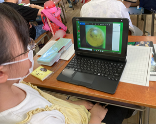 4年生が理科「天気と一日の気温」の学習をしました。明日から協力して気温を測定します。また、顕微鏡で見たアゲハチョウの卵の様子をタブレット端末で見て、スケッチをします。午後からの家庭学習の課題です。
