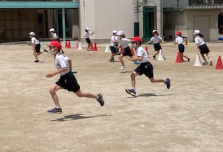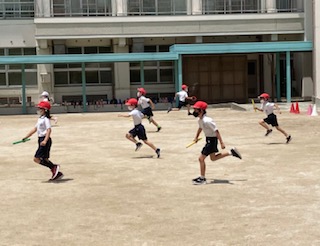 2年生が五月晴れのもと、運動場でリレー遊びをしました。元気いっぱい楽しく運動ができました。