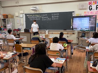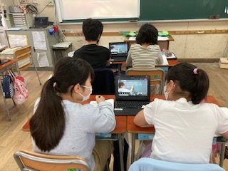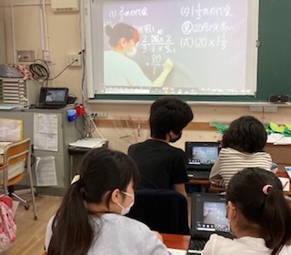 6年生が算数「整数×分数や帯分数の混じった計算の仕方」をオンライン授業で行いました。預かりの児童は教室でリアルタイムで授業を受けました。カメラを移動して板書が見えるようにしたり、タブレット端末の画像を全面表示にしない方が板書が見えることなど、新しい発見がありました。