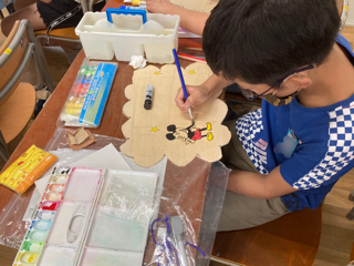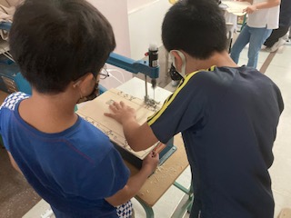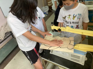 5年生が図画工作で、ホワイトボードを作っています。電動のこぎりで木を切り、色を塗って完成させます。できあがりが楽しみです。