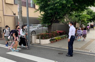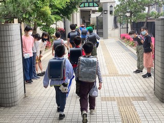 本日は、通常の登校時間に全校児童が登校しました。正門前には、児童会運営委員の児童があいさつをしてくれました。久しぶりに活気のある朝の様子となりました。