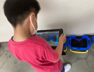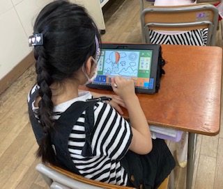 1年生がタブレット端末を使い始めています。お絵描きソフトで色を塗りました。また、あさがおの写真を撮って観察記録を作っていきます。今日はアサガオが植えられた写真を撮りました。