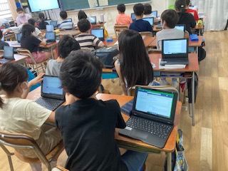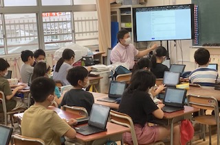 5年生が双方向通信Teamsのクラス会議に参加して、予定の確認や課題の提出をしています。タブレット端末に触れる機会を増やしています。