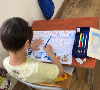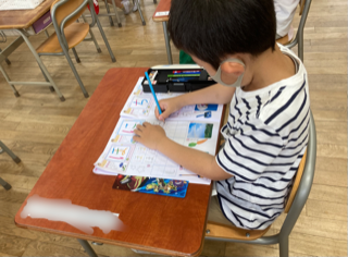 大雨警報が発令されましたが、子どもたちは無事に登校しました。24日(月)からは通常授業となります。昨日と本日は4時間授業をして、体と心を慣らしていきます。1時間目の1年生の学習です。姿勢を正しく丁寧にひらがなを書いています。