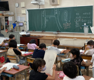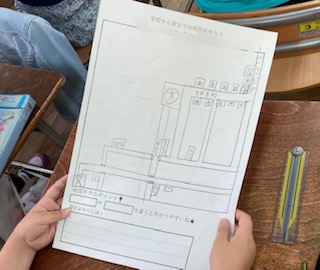 3年生が、学校から家までの地図を作りました。毎日登下校で歩いている道ですが、いざ地図に表すとなると、難しいです。曲がり角に何があったのか、どの筋を曲がるのかなど、目印を書き入れることに苦戦していました。