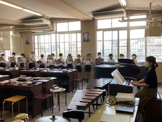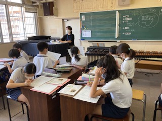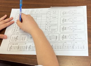5年生が、感染対策を講じて音楽の学習をしました。マスクをして、対面にならないように並び、小さい声で歌を歌いました。また、音符、休符、記号の学習をしました。法則性がわかれば、たくさんの音符や記号もよくわかりました。