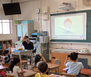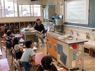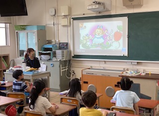 毎週火・木曜日の朝10分間に、英語活動を行っています。1年生がABCと楽しく声を出し、英語の歌を歌っています。楽しく英語に触れている姿を見て、うれしくなります。