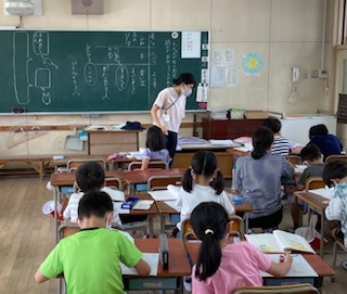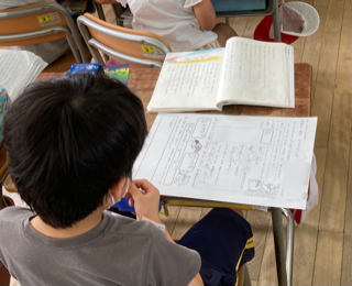 2年生が国語「名前を見てちょうだい」を学習しています。ワークシートを使って、自分の考えを書き、発表しています。