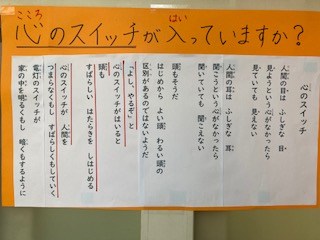 Teamsで全校朝会をしました。健康委員会からは、「今日から保健週間です。手洗いをしっかりとしましょう」と、連絡がありました。また、環境美化委員会からは、「トイレのスリッパをそろえましょう。掃除は静かにできるようにがんばりましょう」と、連絡がありました。校長先生からは、『心のスイッチ』という詩の紹介と、自分から「心のスイッチ」を入れて、がんばっていきましょうとお話がありました。
