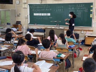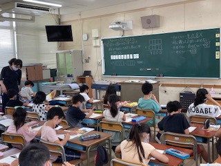 3年生が算数「式の作り方を考えよう」を学習しました。0から9までのカードを使って答えが9000になるたし算の式を考えました。ただし、同じ数は2回使えません。子どもたちは千、百、十、一の位にあるきまりをみつけて考えました。最高5つの式をみつけた児童がいました。しっかりと楽しく考えていました。