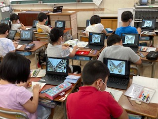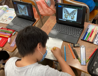 3年生が理科の学習で、チョウの成虫の体のつくりを調べるために、スケッチをしました。足が6本あることなど発見していました。