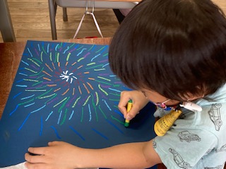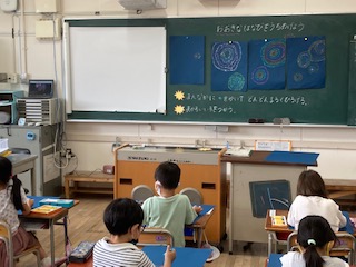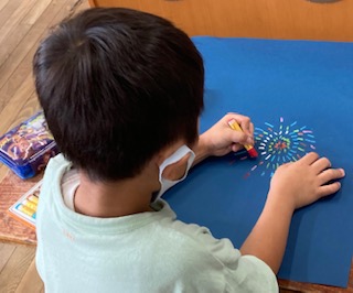 1年生が花火を作っています。花火といっても、画用紙に大きな花火を打ち上げます。真ん中に点を描いて、どんどん丸く広げて花火を作ります。明るい色を使って、夜空に輝く花火ができあがります。7月には教室中に花火が打ち上がっていると思います。とても楽しみです。