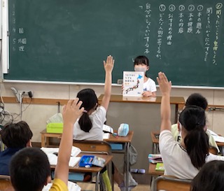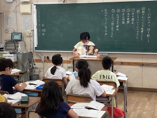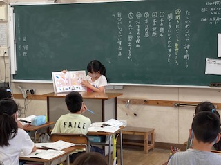 4年生が国語「たしかめながら話を聞こう」を学習しています。「おすすめの本」のスピーチを聞いて、たずねたいことを整理して質問しました。