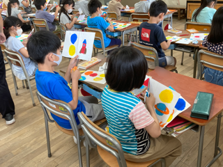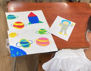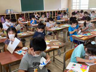 2年生が図画工作「宇宙へ行こう」を描いています。今日は、前時で描いた宇宙飛行士、惑星や恒星、星などを切り取りました。パスの上を切り取るようにしました。この後は、黒い画用紙に貼り、絵の具で宇宙の空を表していきます。できあがりか楽しみです。