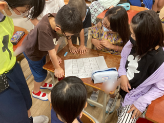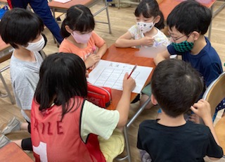 毎週水曜日の朝は、たてわり班で集まり集会をします。集会委員会がゲームを考えて運営しています。今日は学校の先生の名前を覚えようと、「先生ビンゴゲーム」をしました。