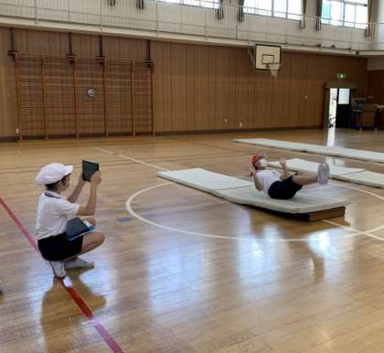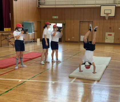 6年生が体育「マット運動」をしました。補助倒立前転、開脚前転、伸膝後転などをしました。また、技を組み合わせた練習をしました。タブレット端末で技の様子を撮影して、振り返りました。