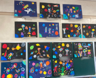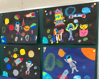 2年生の教室には、図画工作で描いた宇宙を旅している絵が掲示されています。見ているだけで楽しくなります。