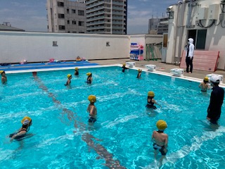 今日から水泳学習が始まりました。感染症対策を講じての実施となりますので、基本的には学級で週1回プールに入ります。本日は、1年ろ組の児童が、小学校で初めてプールに入りました。楽しく学習できました。