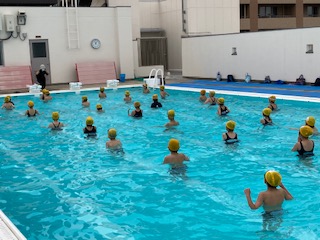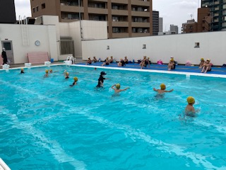 2年い組の児童が水泳学習をしました。昨年度1年生の時は、水泳学習が中止でしたので、小学校で初めてのプールになります。シャワーの浴び方、プールの入り方、ハンドサインなどを習い、その後は大きなプールで楽しく水慣れや水遊びをしました。