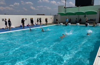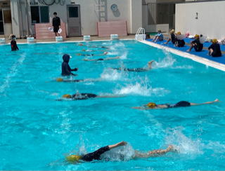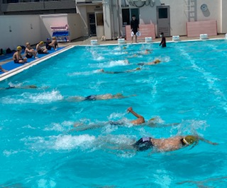 6年い組とろ組が水泳学習をしました。時間割の編成により、3回だけ2クラスで学習をします。快晴のもと、け伸び、バタ足、面かぶりクロール、25mクロールなどをしました。また平泳ぎのキックの練習をしました。