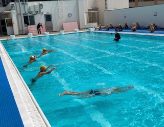 3年い組の児童が水泳学習をしました。1年生の時以来の水泳です。水慣れ、だるま浮き、くらげ浮き、イルカジャンプ、バタ足などをしました。