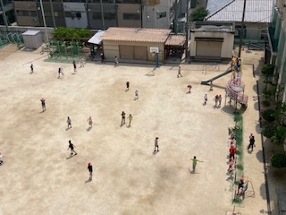 休み時間は元気に運動場で遊んでいます。熱中症防止のため、帽子をかぶって遊びます。