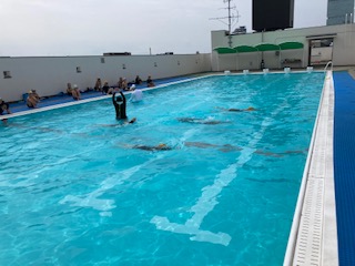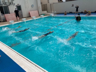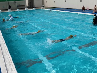 4年は組の児童が水泳学習をしました。水慣れ、浮く、潜るの練習した後、バタ足やクロールをしました。また、泳力をはかりました。