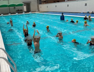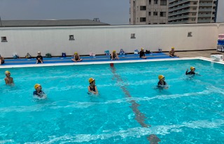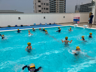 1年い組の児童が水泳学習をしました。小学校の大きなプールにはじめて入りました。水泳学習のルールやきまりを学びました。プールの中を走ったリ、ジャンプしたりしました。ぞうやかにの動きを真似て水の中を歩いたりしました。楽しく水遊びができました。