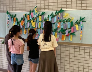 玄関の掲示板には、6年生が作った七夕飾りがあります。短冊に願いが書いてあります。読んでみると、コロナの早期の収束、家族の健康、スポーツや習い事の上達、受験や英検、漢検の合格などが書かれています。子どもたちの願いが叶ってほしいです。