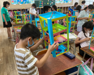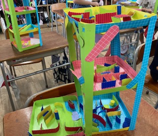 4年生が図画工作「コロコロガーレ」を作っています。4層の迷路を上からビー玉を転がし、一番下のゴールまで転がす工作を作りました。作ったもとで、楽しく遊びました。