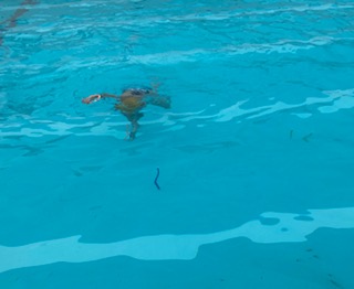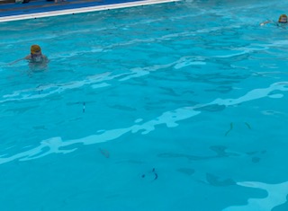2年い組の児童が水泳学習をしました。今日はもぐる運動遊びをしました。水中にあるリングや棒を潜って取りました。密にならないように、リングや棒が縦に並べてあり、ひとりで取りに行きます。時間内にいくつ取れるかをしました。