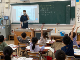 1年生が算数「どちらがながい」を学習しています。前時ではテープを使って長さをはかりましたが、本時はテープを使わないで、手や鉛筆を使って、いくつ分あるかではかりました。