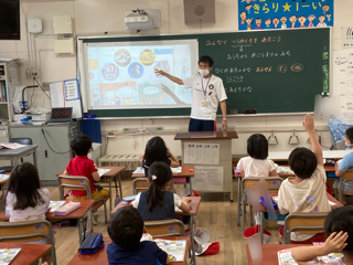 1年生が生活科「みんなで通学路を歩こう」を学習しています。通学路の様子や安全を守っている人々などについて考え、安全で適切な行動ができるようにすることが、ねらいです。