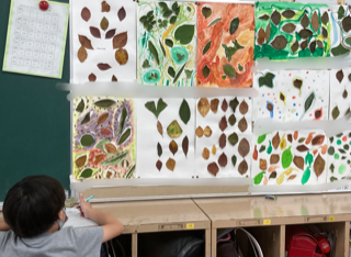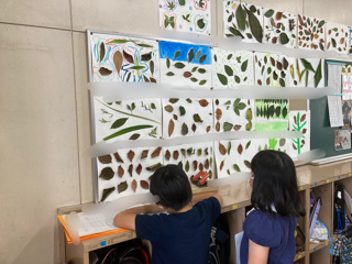 3年生では、図画工作「み近なしぜんの色・形」の学習で作った作品を掲示しています。鑑賞として、友だちの作品のいいところを見つけて、カードに書きました。