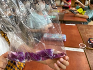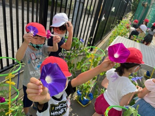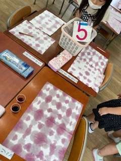 一年生がアサガオの花で色水遊びをしました。半紙を折って色水をつけ、様々な模様を楽しみます。半紙を広げたときには「わーきれい!」「ここの形がハートみたい!」と歓声が湧き上がりました。