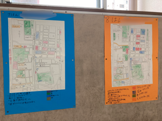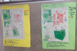 3年生の教室前廊下には、社会科で「私たちの町のようす」で取り組んだ大江の町の様子を地図に表しました。