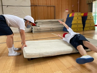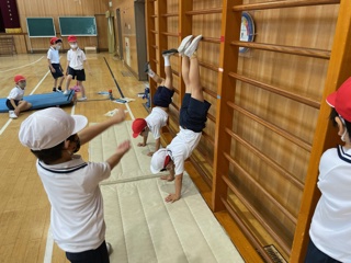 一年生が体育の時間に「マットあそび」をしています。今日は、そのまとめとして発表会をしました。「かべのぼりさかだち」や「さかみちで、まえころがり」「かえるのあしうち」など、いろいろな転がり方や逆立ちができました。