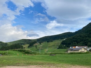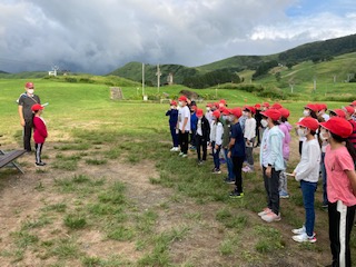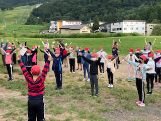 晴れ間が見え、澄んだ空気のもと、朝の会をしました。子どもたちは昨夜はぐっすり寝ました。全員元気に朝を迎えました。ラジオ体操をして、寝ている体を起こして2日目がスタートしました。