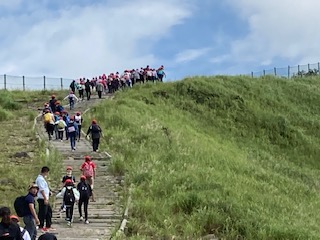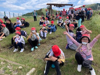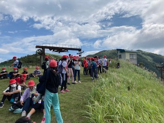 スキー場のゲレンデを登り、途中で休憩しました。子どもたちは元気に登っています。