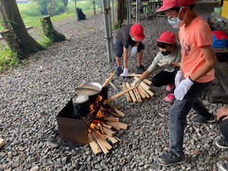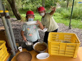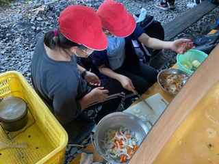 本日の昼ご飯は、カレーライスです。各班で協力して野菜を切り、火を起こして、ご飯とカレーを作りました。みんなで作ったカレーライスは格別の味がしました。